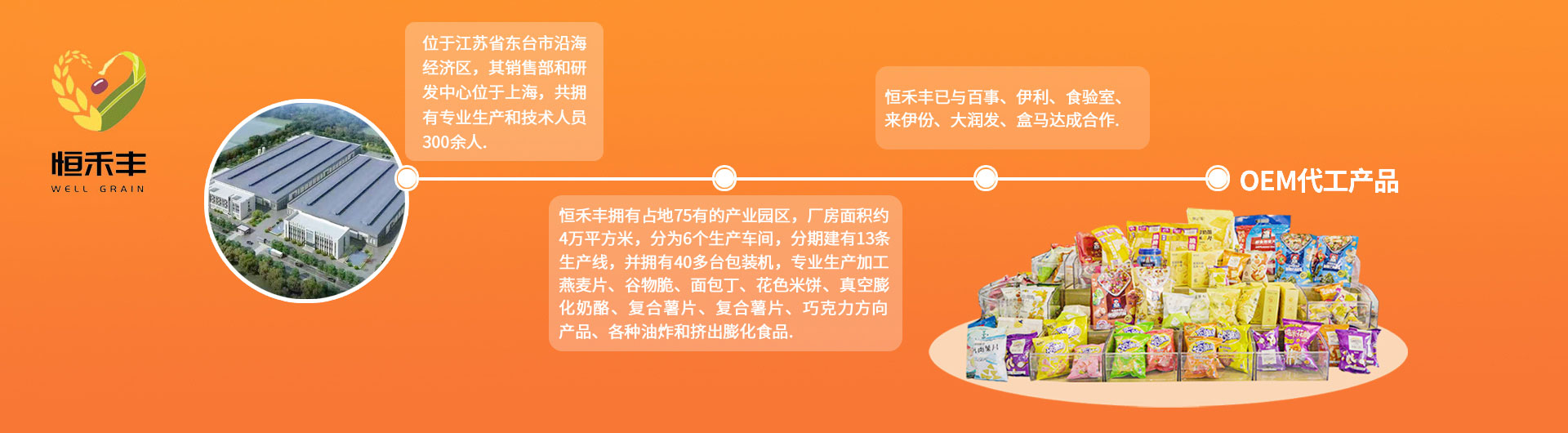 目前,恒禾豐擁有占地75畝的產(chǎn)業(yè)園區(qū),廠房面積約4萬平方米,分為6個(gè)生產(chǎn)車間,分期建有13條生產(chǎn)線,并擁有40多臺(tái)包裝機(jī),專業(yè)生產(chǎn)加工燕麥片、谷物脆、面包丁、花色米餅、低溫真空膨化奶酪及果蔬、各種油炸和擠出膨化食品。